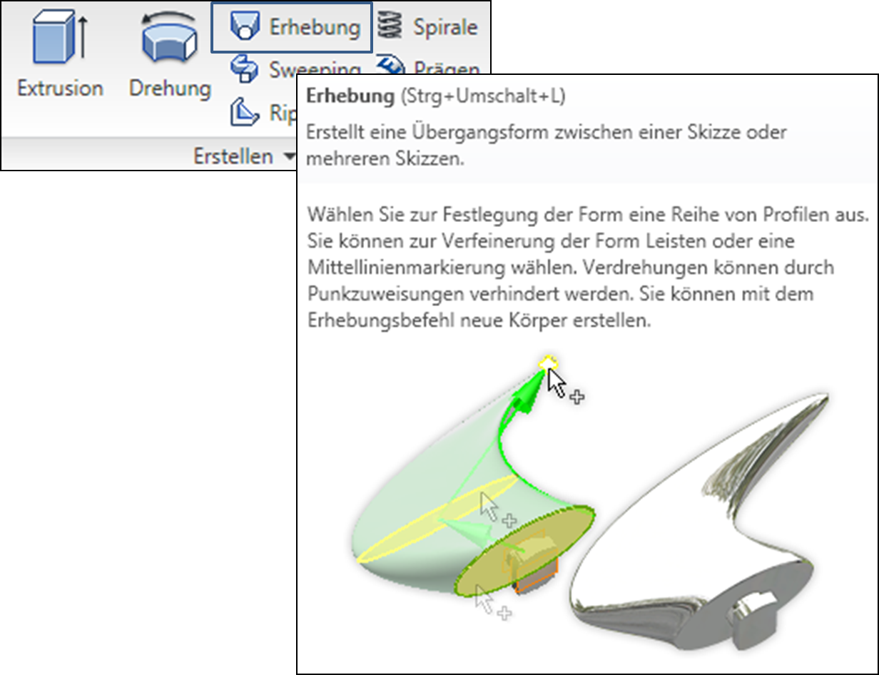 Klicken Sie auf der Registerkarte Modell in der Gruppe Erstellen auf Erhebung, um ein Erhebungselement zu erstellen, indem Sie mehrere Profile, sogenannte Abschnitte, verschmelzen und in glatte Formen zwischen den eingeschlossenen Profilen oder Bauteilflächen übertragen. Zusätzlich zu den Skizzierprofilen können Sie auch Objektflächen und -punkte auswählen, die sie als erhabene Abschnitte einschließen können.