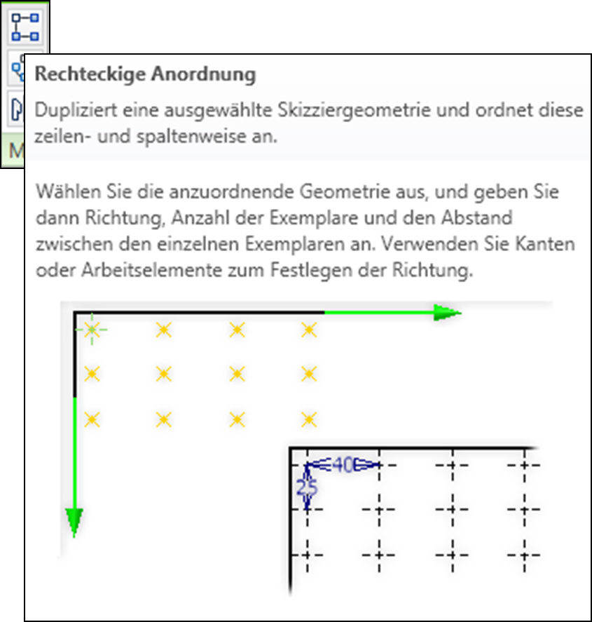 Musterfunktionen dienen zur Vervielfältigung von bereits erzeugten geometrischen Elementen. Diese Funktionen sind im Werkzeugkasten "Muster" zusammengefasst.